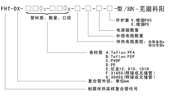| FHT-D45-B2Φ8-1Φ6-a-1-0-v ①外徑45mm ②采樣管3根材質(zhì)Teflon FEP 2根Φ8,1根Φ6 ③自控溫電熱帶1根 60GBR2-P 60W/m220V ④補(bǔ)償電纜1根 ⑤外護(hù)套增強(qiáng)PVC | 6 |